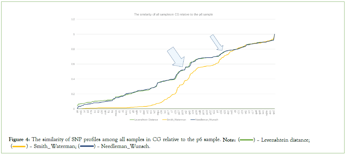 Method 3: Needleman-Wunsch algorithm: This method is similar to method 2, but this method adopts a global optimal alignment scheme, that is, considering the overall similarity of the two sequences instead of the local similarity. We also unite the bases of all sites into a string, and then use this algorithm to construct a score matrix to calculate the similarity score between the two strings, and then obtain the similarity rate [19]. We applied these three methods to the calculation of similarity, and obtained the similarity between any two samples, as well as the similarity of all samples relative to the reference sample p6, and also drew a similarity change curve to intuitively demonstrate changing trends.