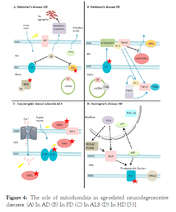 Figure 4. The role of mitochondria in age-related neurodegenerative diseases. (A) In AD (B) In PD (C) In ALS (D) In HD [53].