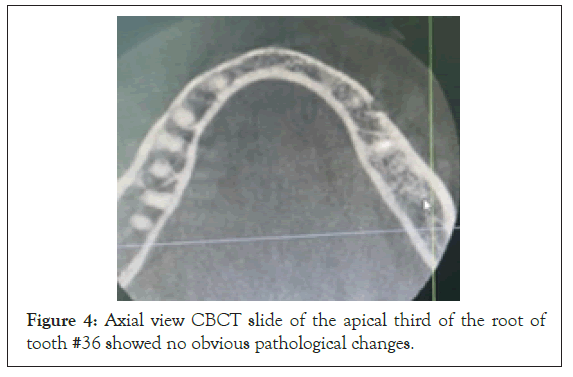 Figure 4: Axial view CBCT slide of the apical third of the root of tooth #36 showed no obvious pathological changes.