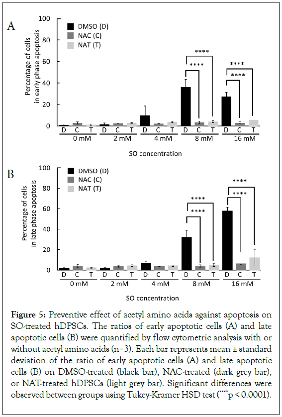 Figure 5: Preventive effect of acetyl amino acids against apoptosis on SO-treated hDPSCs. The ratios of early apoptotic cells (A) and late apoptotic cells (B) were quantified by flow cytometric analysis with or without acetyl amino acids (n=3). Each bar represents mean ± standard deviation of the ratio of early apoptotic cells (A) and late apoptotic cells (B) on DMSO-treated (black bar), NAC-treated (dark grey bar), or NAT-treated hDPSCs (light grey bar). Significant differences were observed between groups using Tukey-Kramer HSD test (****p < 0.0001).