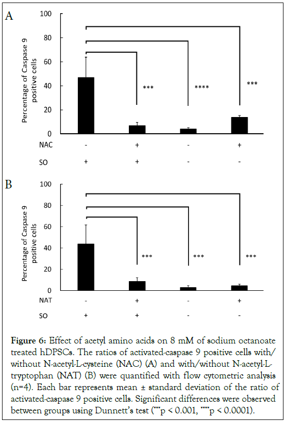 Figure 6: Effect of acetyl amino acids on 8 mM of sodium octanoate treated hDPSCs. The ratios of activated-caspase 9 positive cells with/ without N-acetyl-L-cysteine (NAC) (A) and with/without N-acetyl-L- tryptophan (NAT) (B) were quantified with flow cytometric analysis (n=4). Each bar represents mean ± standard deviation of the ratio of activated-caspase 9 positive cells. Significant differences were observed between groups using Dunnett’s test (***p < 0.001, ****p < 0.0001).