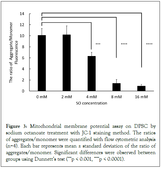 Figure 3: Mitochondrial membrane potential assay on DPSC by sodium octanoate treatment with JC-1 staining method. The ratios of aggregates/monomer were quantified with flow cytometric analysis (n=4). Each bar represents mean ± standard deviation of the ratio of aggregates/monomer. Significant differences were observed between groups using Dunnett’s test (***p < 0.001, ****p < 0.0001).