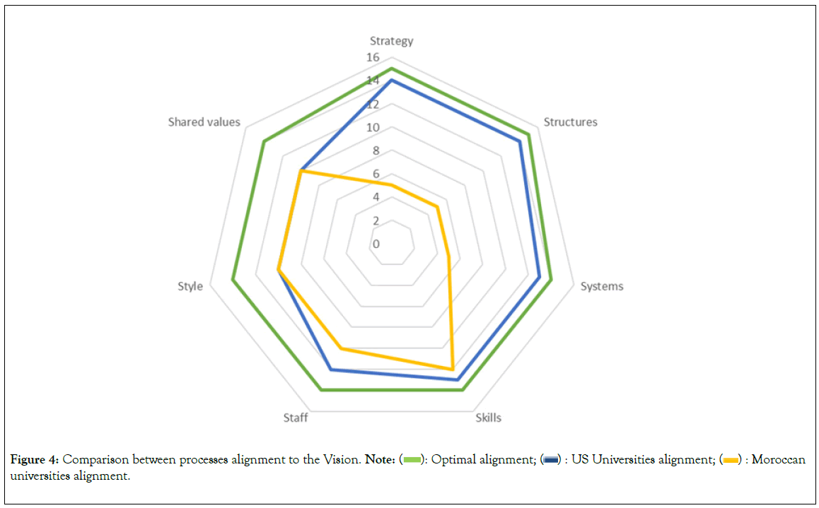 Comparing to American alignment process within large organizations, which is based on a comprehensive approach relying on scientific tools such as the “7S model” our research revealed that national public universities’ community system does not apply any methodology to detect in time any deficiencies or discrepancies to realize the alignment process when necessary [20]. Indeed, when dysfunctions are identified, SLs must immediately proceed with the necessary alignment at all levels, paying particular attention to synchronization, convergence, and coherence with the vision. In short, SL focuses on strategic decisions that bind the future of the organization over a long period of time in terms of alignment, vision, and change processes [21]. The fundamental objective is to understand the components, dynamics, and interdependencies of their internal/external environments in general and especially the endogenous reasons that led to the emergence of challenges, such as any kind of resistance within their organizations, including a possible inappropriate structure and/or policies or procedures in force.