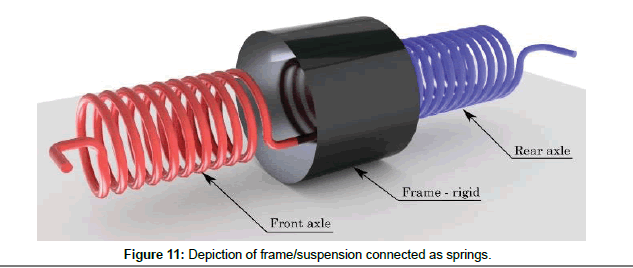 First, roll stiffness of the individual axles was calculated (Table 6). We can then imagine the front axle – frame – rear axle structure as system of springs connected in series. This is depicted in Figure 11 below.