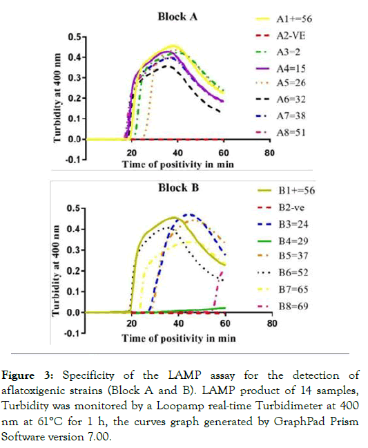 Figure 3: Specificity of the LAMP assay for the detection of aflatoxigenic strains (Block A and B). LAMP product of 14 samples, Turbidity was monitored by a Loopamp real-time Turbidimeter at 400 nm at 61°C for 1 h, the curves graph generated by GraphPad Prism Software version 7.00.