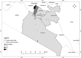 On the other hand, Machakos County borders Nairobi to the West with a total area of 5,953 km²; it lies between latitude 1.35°S and 1.44°S, longitude of between 36.94°E and 37.80°E, and an altitude of between 1000 to 2100 m above sea level. It falls in the upper highlands agro-ecological zone hence classified as semi-arid [10]. It records an average annual rainfall of 830 mm and an average temperature of 19.0°C. The County is dominated by low fertile and easily erodible soils such as Alfisols, Ultisols, Oxisols, and L. ithic [4]. Each of the sub-counties within all the three was covered wholly or partially in the study.