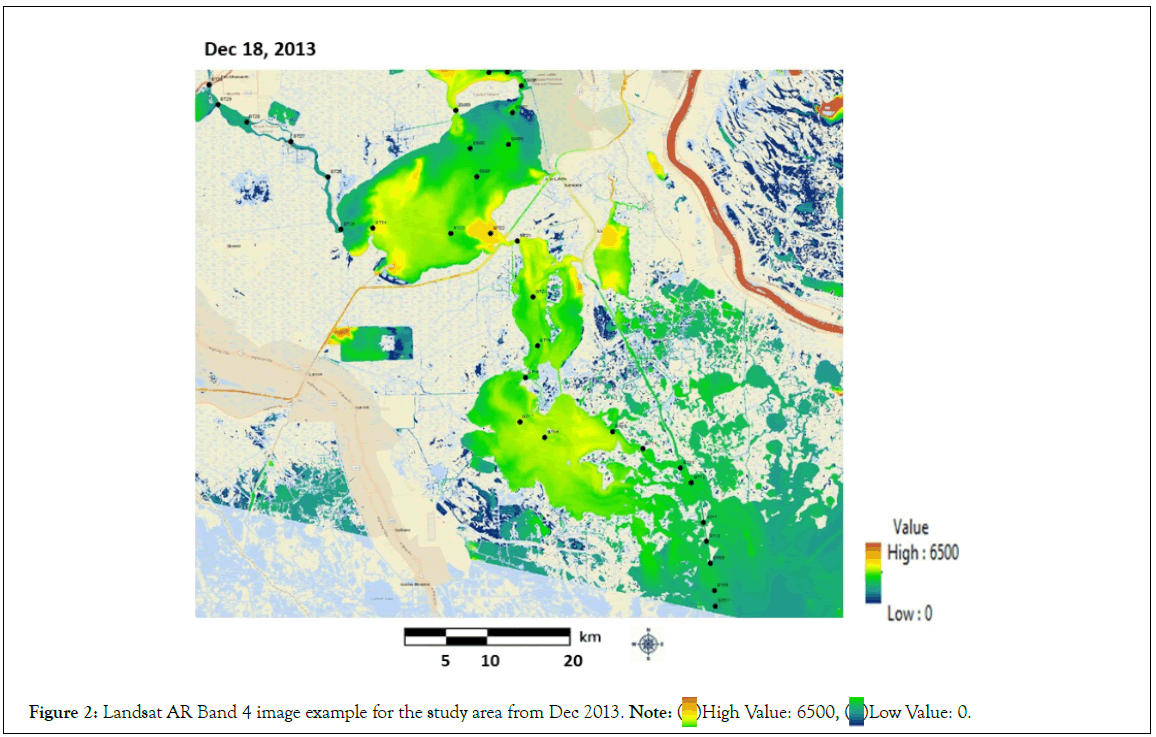 An analysis of Landsat aquatic reflectance images acquired since 2013 over the Barataria Basin estuaries and lakes on the Louisiana Gulf Coast was presented in this study, including correlation results to relate reflectance values to a monthly water quality data set sampled along a transect from freshwater lakes and bayous to the Gulf of Mexico [11]. Strong correlation relationships were found between Band 4 (Red) reflectance data from the Landsat images and TSS, TP, and Chl-a concentrations measured along the sampling transect. The main finding from this study is that Landsat ar Band 4 patterns in the Barataria Basin and Breton Sound were consistent with measured nutrient and Chl-a declines associated with lower influence of freshwater inputs, from coastal estuaries moving toward more saline Gulf waters.