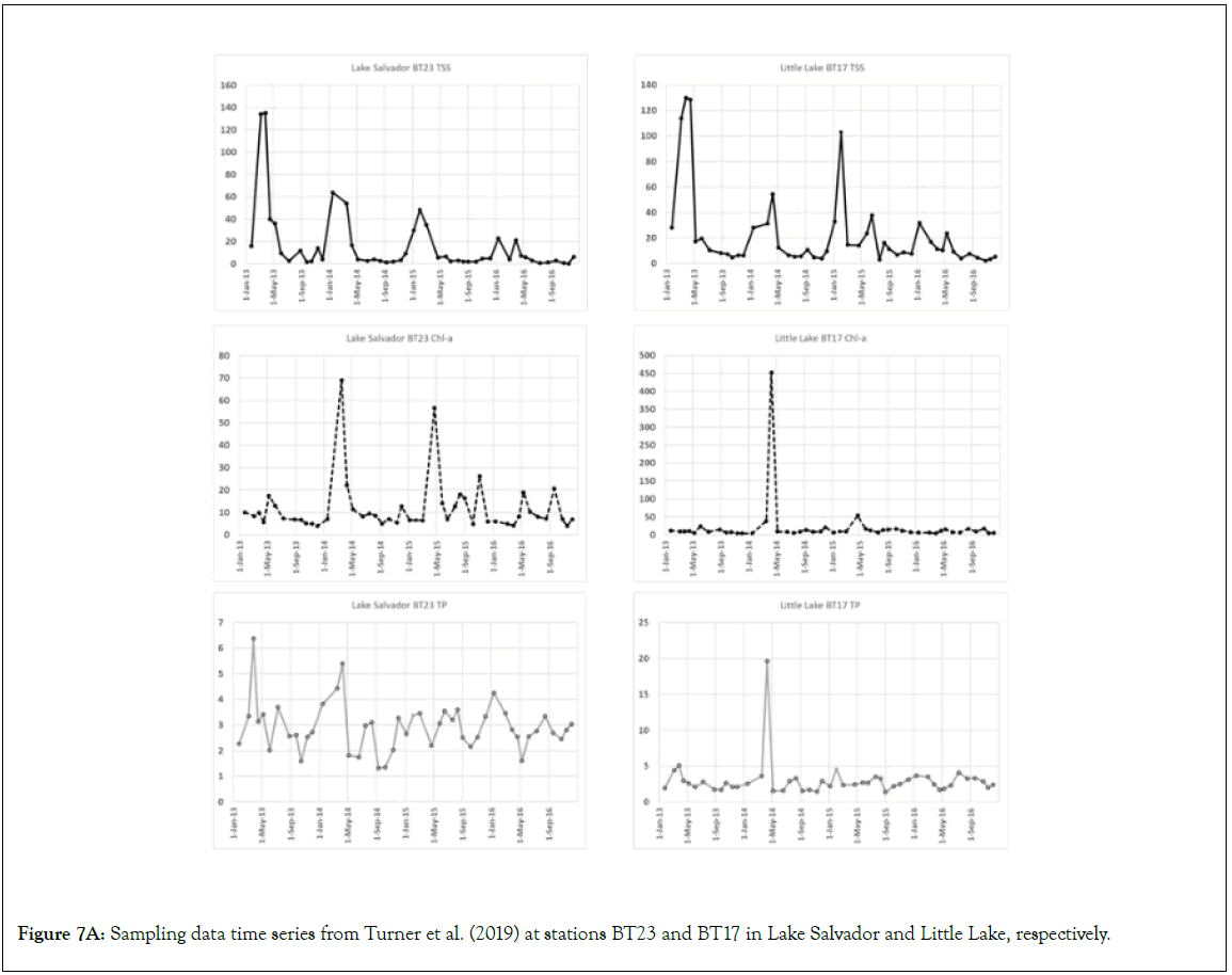 Figure 7A: Sampling data time series from Turner et al. (2019) at stations BT23 and BT17 in Lake Salvador and Little Lake, respectively.