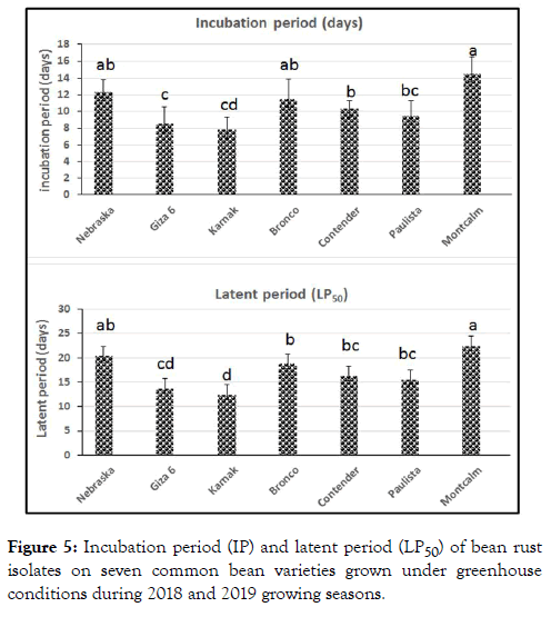 Incubation period of the tested bean rust isolate varied considerably in the seven bean varieties under study, and it was ranged from 7.8 days to 14.5 days (Figure 5). The longest incubation period was found in slow-rusting bean varieties; Montcalm, Nebraska and Bronco (11.5 to 14.5 days). In contrast, the other bean varieties Karnak, Giza 6, paulista and Contender recorded shorter incubation periods 7.8, 8.5, 9.4 and 10.3 days, respectively. Thus, these varieties considered highly susceptible or fast-rusting (Figure 5).