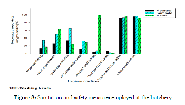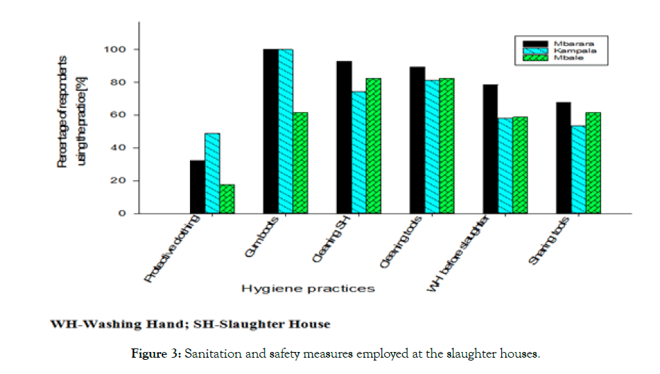 As a safety and sanitation measure in slaughter houses and slabs, it is a requirement that the different personnel should wash hands, put on protective clothing, wear gumboots, clean tools and wash the slaughter house after slaughter. There should be no sharing of tools among these slaughter operators. Results of this study show high compliance in wearing gumboots (87.6%) but sharing of tools was common (60%) in all the districts of the study and this could be a possible area of cross contamination of beef (Figure 3). It should be noted that sharing of tools (knives and machete) among the different butchers is a possible source of contamination and in this study, 60% of respondents shared tools at slaughter houses. The slaughter houses in Kampala district had 100% compliance to ante-mortem inspection. In Mbarara and Mbale, only 25% adhered to ante-mortem inspection. Furthermore, it was found out that it is only licensed slaughter houses which were practicing ante-mortem inspection while at slaughter slabs this was a rare practice. It was observed that there was no veterinary inspector at slaughter slabs and the personnel in charge possessed inspection stamp illegally.