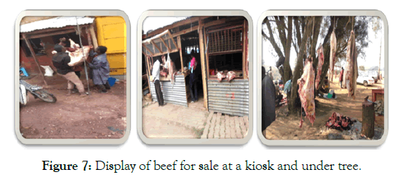 On arrival at the butchery, beef is off loaded manually (Figure 7) to retail shops (butchery) or hanged on tree branches in the open. Ninety six percent of these retails have no cold chain system for preservation. SSOPs require that meat is transported in clean containers and storage of meat should be at low temperatures to prevent meat quality deterioration. All butcheries in the study area displayed beef by hanging and on tables (Figure 7) for marketing purposes and for those butcheries located near the road side, the beef is exposed to dust raised from vehicles.