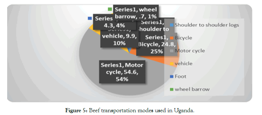 From the slaughter houses to the butchery, 54% of the carcass (beef) is transported by motorcycles followed by bicycles (25%) and 1% used wheel barrows (Figures 5 and 6). The motorcycles are loaded with wooden boxes where beef is placed and then covered during transportation (Figure 6).
