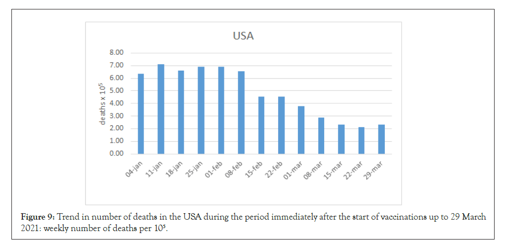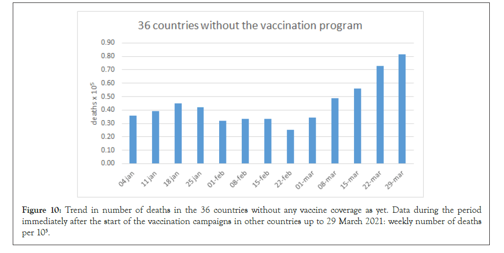 The main limitation of this study is that we have considered the deaths due to COVID-19 during the first four weeks of the vaccination campaign (from the week of 4 January to the week of 28 January) with those after ten weeks of vaccination (from 2 March to 29 March). This was done considering the overall death trend in the world, which reached its highest values in the period between 8 and 28 January and lowest levels in the period between 2 and 29 March 2021 .