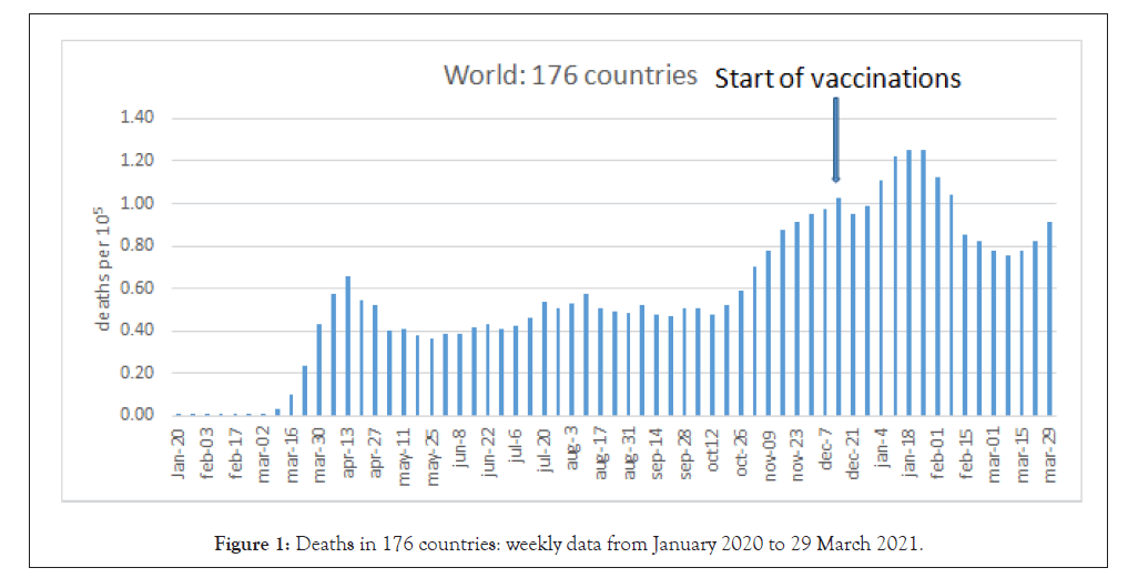 Data on the number of deaths due to COVID-19 in 176 countries were considered. However, the number of vaccine shots was only recorded for 140 [1]. The total number of deaths due to COVID-19 up to 28 December in the 176 countries concerned came to 1,835,720. On this date, vaccination had started in the UK, the USA and Israel only (7, 14, and 19 December respectively), and the effect of these campaigns on the death rate in the world on 28 December was very limited. Most of the countries which decided to aim for vaccine coverage started administrations in the first two weeks of January. The trend in deaths from January 2020 to the week ending 29 March is shown (Figure 1).