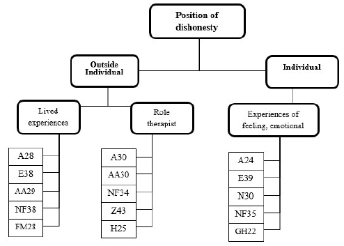 In this axis, we categorized two categories of concepts that the reasons for clients' dishonesty include individual and out individual that the individual category includes feeling and affection experiences and the out individual category includes the therapist's reaction and lived experiences in society (Figure 1). In the individual category, feeling and affection experiences refer to events which is feeling and affection relationships, dishonesty due to shame, dishonesty due to avoiding negative emotions, dishonesty due to avoiding guilt and dishonesty in negative and wrong function that the client is consciously or unconsciously put in a position of dishonesty in the treatment room due to his negative evaluation of himself. For example, one of the clients named Fahima said;