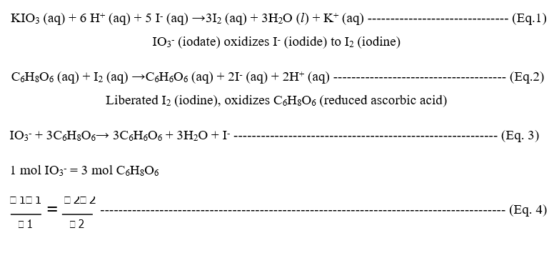 Vitamin C or ascorbic acid content in the fruit samples was determined by titrimetric method using potassium iodate as a standard solution due to good oxidizing agent ability. The amount of ascorbic acid in the fruit samples was calculated using the following redox reactions [9].