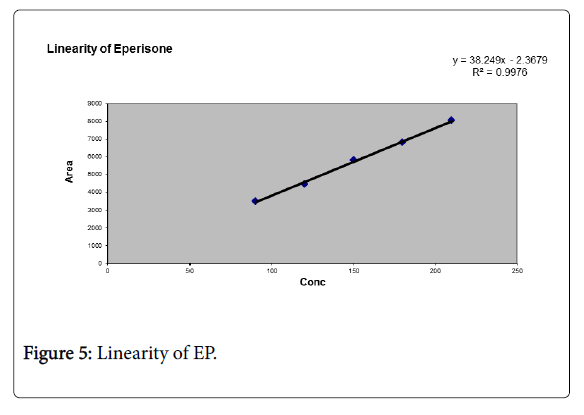 A graph was plotted for EP and DF against the concentrations of the solutions and the peak areas. The correlation coefficient R2 was determined and the linearity was found to be 0.997 for EP and 0.998 for DF (Tables 2 and 3; Figure 5).