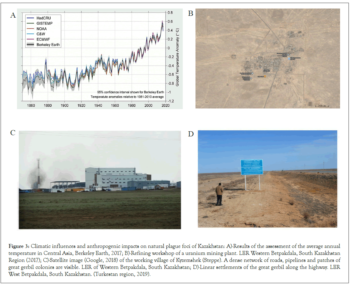 Figure 3: Climatic influences and anthropogenic impacts on natural plague foci of Kazakhstan: A)-Results of the assessment of the average annual temperature in Central Asia, Berkeley Earth, 2017; B)-Refining workshop of a uranium mining plant. LER Western Betpakdala, South Kazakhstan Region (2017); C)-Satellite image (Google, 2018) of the working village of Kyzemshek (Steppe). A dense network of roads, pipelines and patches of great gerbil colonies are visible. LER of Western Betpakdala, South Kazakhstan; D)-Linear settlements of the great gerbil along the highway. LER West Betpakdala, South Kazakhstan. (Turkestan region, 2019).