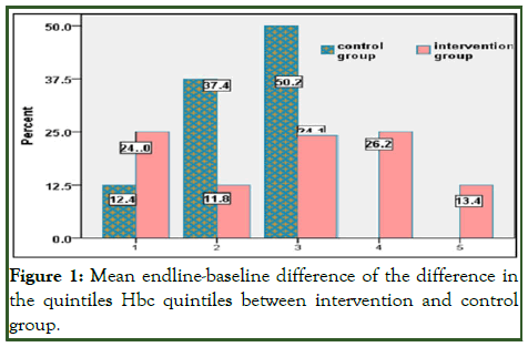 In our rank analysis to compare the mean of endline-baseline difference of the difference in the quintiles of Hbc between intervention and control groups showed that near to 50% control group subjects found at lower ranks (1st and 2nd). However, significant proportion (40.1%) of in intervention group subjects found at higher rank (4th and 5th). But, nothing observed from the control group at 5th rank. In advance analysis, the proportion of study subjects assigned to control group had not found at higher ranks (4th and 5th). For more interpretation perceive Figure 1.