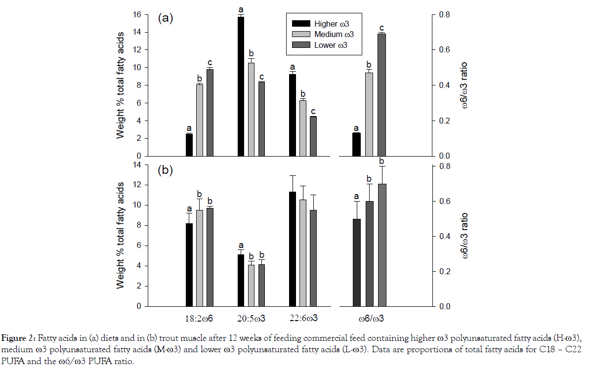 Figure 2: Fatty acids in (a) diets and in (b) trout muscle after 12 weeks of feeding commercial feed containing higher ω3 polyunsaturated fatty acids (H-ω3), medium ω3 polyunsaturated fatty acids (M-ω3) and lower ω3 polyunsaturated fatty acids (L-ω3). Data are proportions of total fatty acids for C18 – C22 PUFA and the ω6/ω3 PUFA ratio.