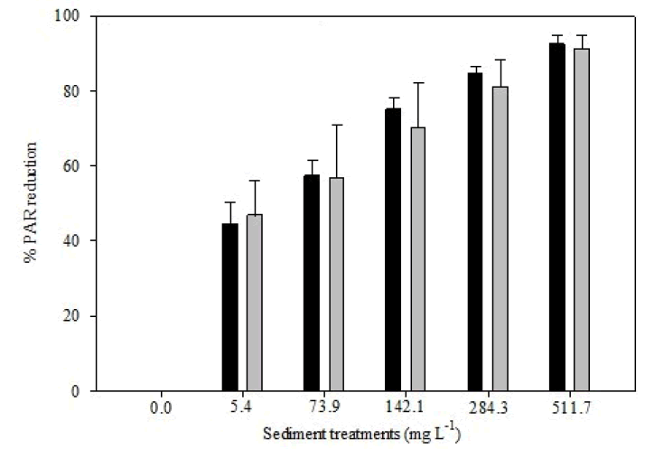 Photosynthetically Active Radiation (PAR) decreased with increasing sediment treatment, data is reported as mean percent PAR reduction (Figure 1). Significant differences among treatments were detected in PAR at both days 0-10 (Kruskal Wallis, H=22.40, p=0.00) and days 0-30 (Kruskal Wallis, H=104.65, p=0.00). Pairwise comparisons showed differences between treatment groups during days 0-10 and 0-30 (Supplementary Figures 6A and 6B).