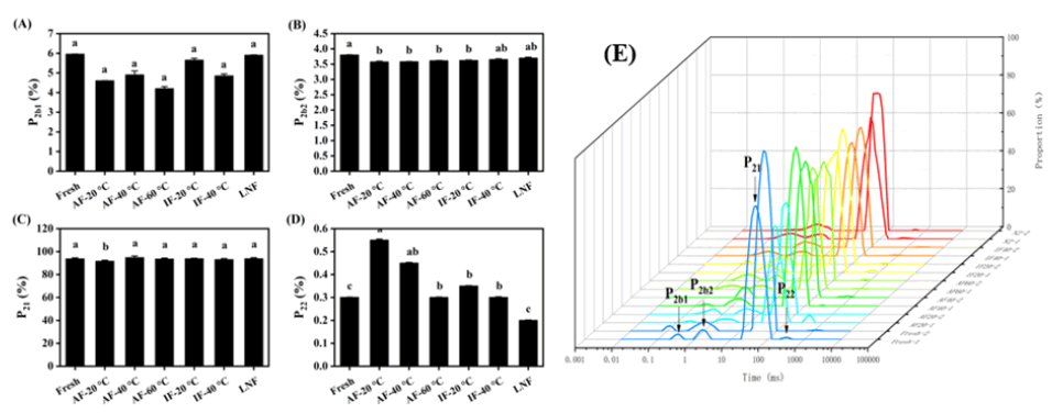 Moisture distribution is a critical index for assessing food quality and water-holding capacity [18]. The measurement of relaxation time was represented by the hydrogen proton’s transverse relaxation time (T2). T2b1 and T2b2 represented the bound water (1 ms–10 ms), T21 represented the immobile water (10 ms–100 ms), and T22 represented the free water (>100 ms). As shown in Figure 5, immobile water constituted the largest proportion, accounting for over 90% of the total. Compared with the control group, the AF -20°C groups showed a significant decrease in immobile water and a corresponding increase in free water (P<0.05). This may be due to the transformation of some immobile water into free water during air freezing. Furthermore, there was no statistically significant difference in the proportions of bound water, immobile water, and free water peaks among the AF -60°C, IF -20°C, IF -40°C, and liquid nitrogen freezing groups (P>0.05), suggesting that a rapid freezing rate limits the denaturation of myofibrils and thus prevents the conversion of bound and immobile water into free water (Figure 5).