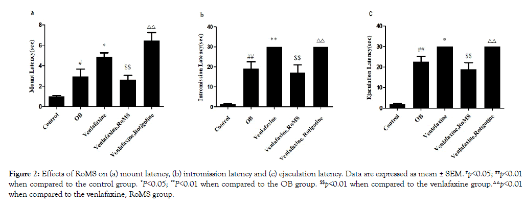 Figure 2: Effects of RoMS on (a) mount latency, (b) intromission latency and (c) ejaculation latency. Data are expressed as mean ± SEM. #p<0.05; ##p<0.01 when compared to the control group. *P<0.05; **P<0.01 when compared to the OB group. $$p<0.01 when compared to the venlafaxine group.△△p<0.01 when compared to the venlafaxine, RoMS group.