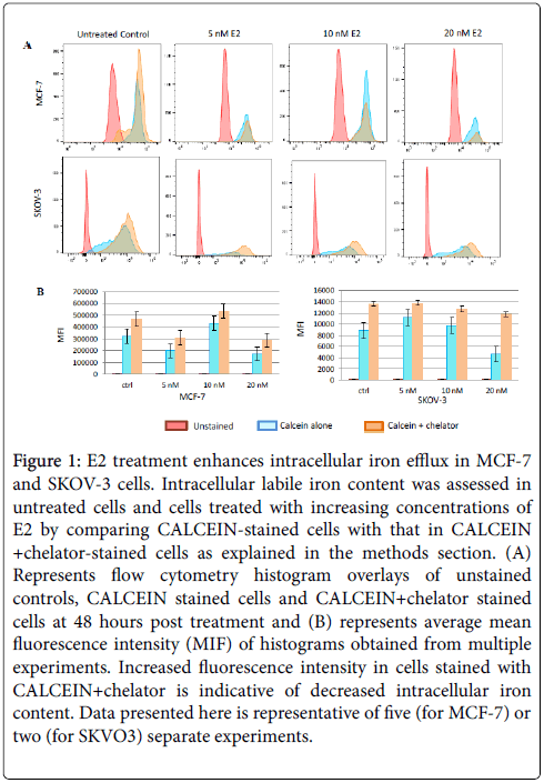 Figure 1: E2 treatment enhances intracellular iron efflux in MCF-7 and SKOV-3 cells. Intracellular labile iron content was assessed in untreated cells and cells treated with increasing concentrations of E2 by comparing CALCEIN-stained cells with that in CALCEIN +chelator-stained cells as explained in the methods section. (A) Represents flow cytometry histogram overlays of unstained controls, CALCEIN stained cells and CALCEIN+chelator stained cells at 48 hours post treatment and (B) represents average mean fluorescence intensity (MIF) of histograms obtained from multiple experiments. Increased fluorescence intensity in cells stained with CALCEIN+chelator is indicative of decreased intracellular iron content. Data presented here is representative of five (for MCF-7) or two (for SKVO3) separate experiments.
