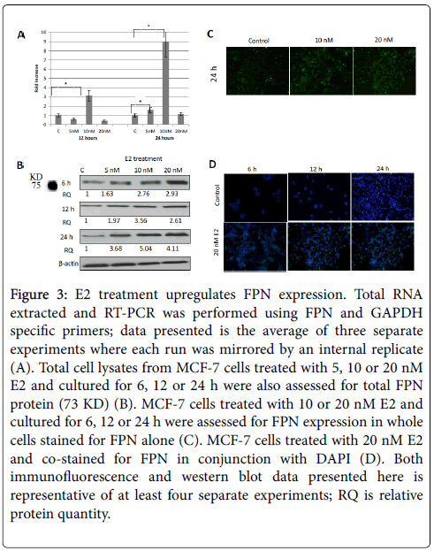 Figure 3: E2 treatment upregulates FPN expression. Total RNA extracted and RT-PCR was performed using FPN and GAPDH specific primers; data presented is the average of three separate experiments where each run was mirrored by an internal replicate (A). Total cell lysates from MCF-7 cells treated with 5, 10 or 20 nM E2 and cultured for 6, 12 or 24 h were also assessed for total FPN protein (73 KD) (B). MCF-7 cells treated with 10 or 20 nM E2 and cultured for 6, 12 or 24 h were assessed for FPN expression in whole cells stained for FPN alone (C). MCF-7 cells treated with 20 nM E2 and co-stained for FPN in conjunction with DAPI (D). Both immunofluorescence and western blot data presented here is representative of at least four separate experiments; RQ is relative protein quantity.