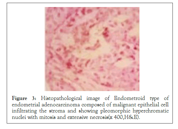Figure 3: Histopathological image of Endometroid type of endometrial adenocarcinoma composed of malignant epithelial cell infiltrating the stroma and showing pleomorphic hyperchromatic nuclei with mitosis and extensive necrosis(x 400,H&E).