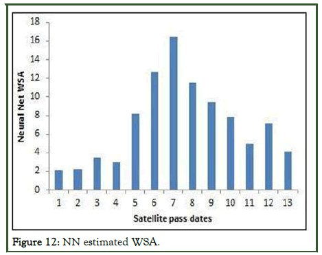 The Figures 8-12 represents the bar graph which shows the estimated water spread area in y axis with corresponding satellite pass dates in x axis.