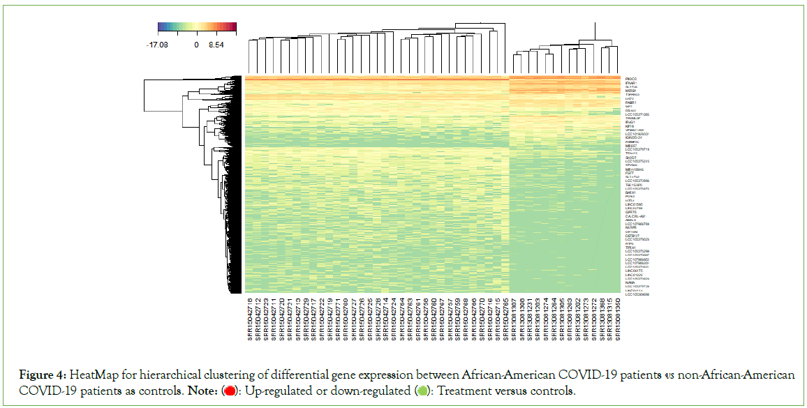 Figure 4: HeatMap for hierarchical clustering of differential gene expression between African-American COVID-19 patients vs non-African-American COVID-19 patients as controls. Note: