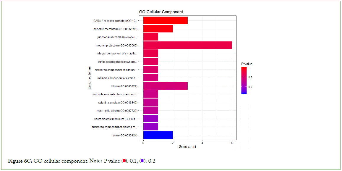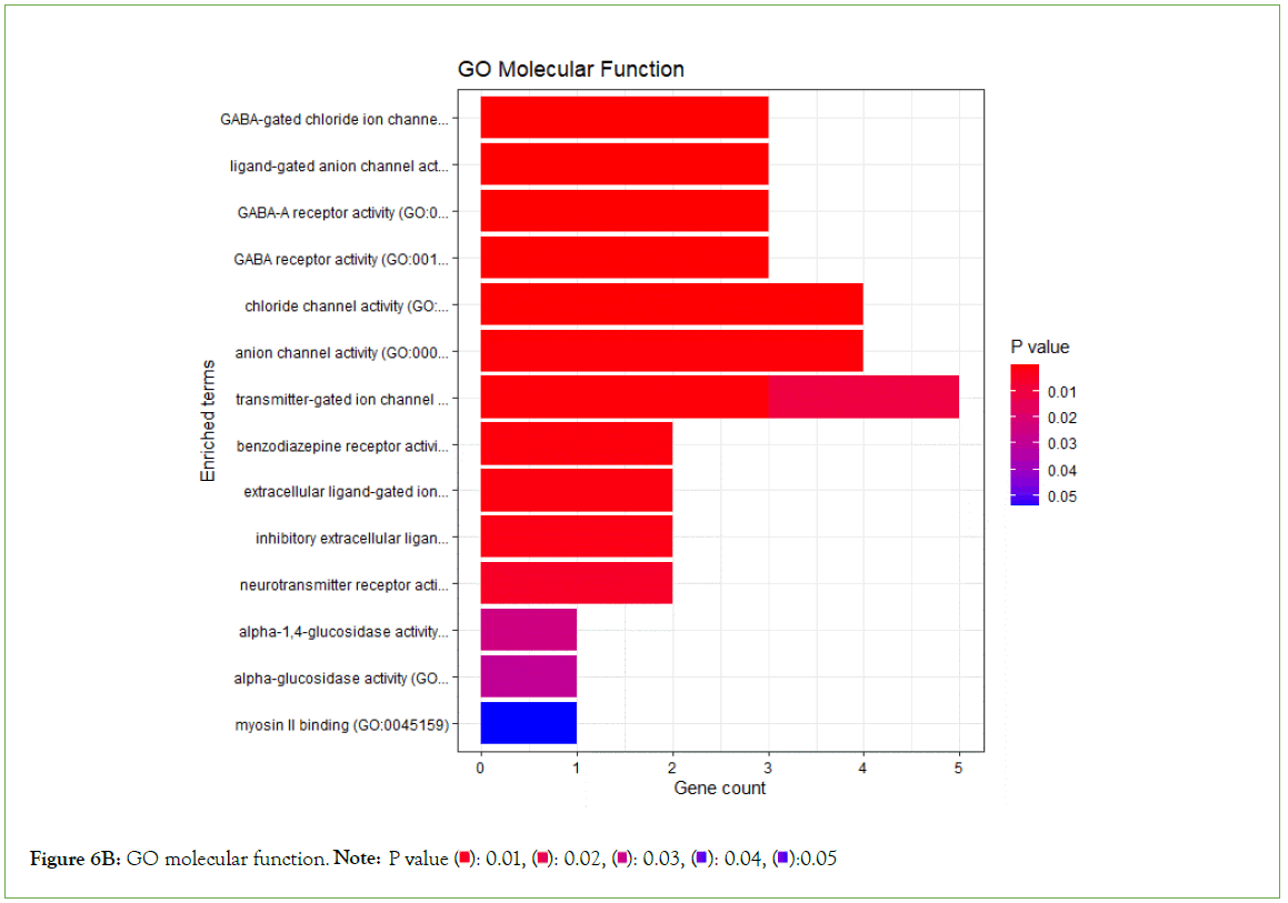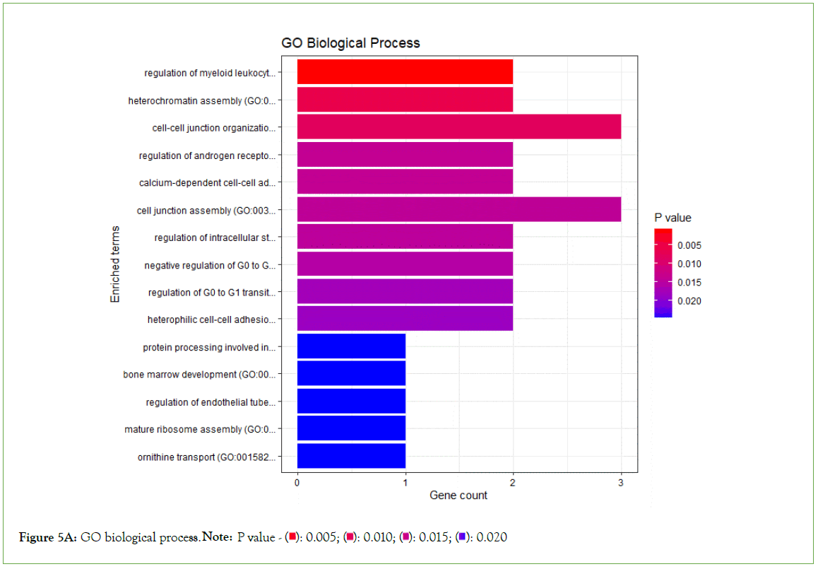 To validate the molecular functions, biological processes, cellular components, and pathways linked with the differentially expressed genes, enrichment analysis was done on significantly under- expressed genes. According to Gene Ontology (GO) biological process, Gene Ontology (GO) molecular function, Gene Ontology (GO) cellular component, and KEGG pathway analysis based on p value, the fifteen most significant molecular functions, biological processes, cellular components, and ten most significant pathways associated with the differentially expressed genes are represented. (Figures 6A-6D).