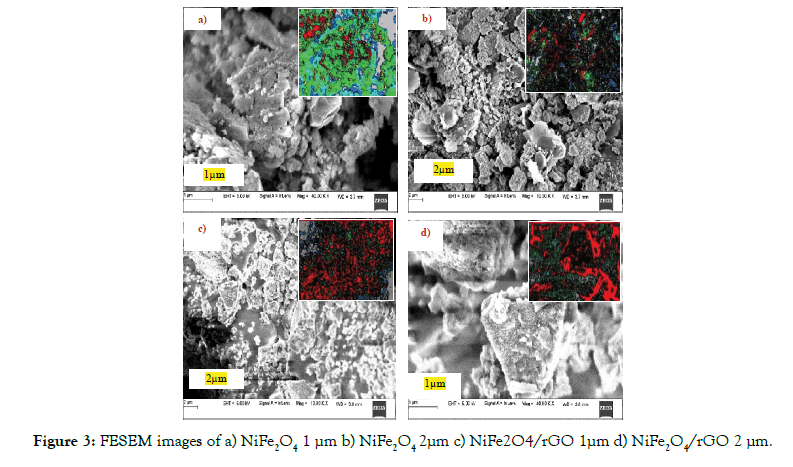 The field emission scanning electron microscopy (FESEM) was used to analyze the surface morphology images of NiFe2O4 and NiFe2O4/ rGO nano composite as shown in the Figures 3a-3d. The surface morphology of particles are composed of various quadrangular shape with 1μm and 2 μm as indicated in Figures 3a and 3b. In Figures 3c and 3d, clearly shows that when reduced graphene was dispersed in the ferrite, The NiFe2O4 can be spread on the surface of nano ferrite forming NiFe2O4/rGO nano composite and the morphology of the particles are well distributed and some have little aggloromation as shown in the Figures 3c and 3d.