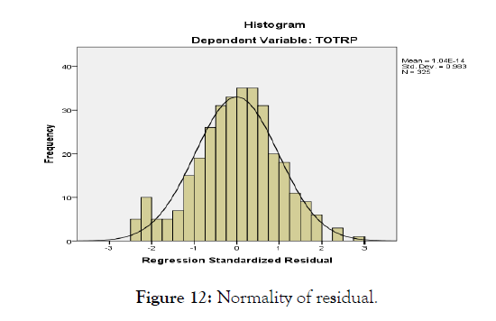 ANOVA (analysis of Variance) also explains the regression by splitting the total sum of squares into regression (explained) sum of squares and error (unexplained) sum of squares. If a regression model is adequate, the explained variance (RSS) should be considerably higher than the unexplained variation (ESS). In the ANOVA table 4.13 the SPSS output illustrates, the total sum of squares (199.889) is split into regression (103.532) and residuals (96.357) which ascertain the condition, F (11,313) =199.889, ρ (0. 000) <α (0. 05).