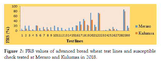 Figure 2: FRS values of advanced bread wheat test lines and susceptible check tested at Meraro and Kulumsa in 2018.