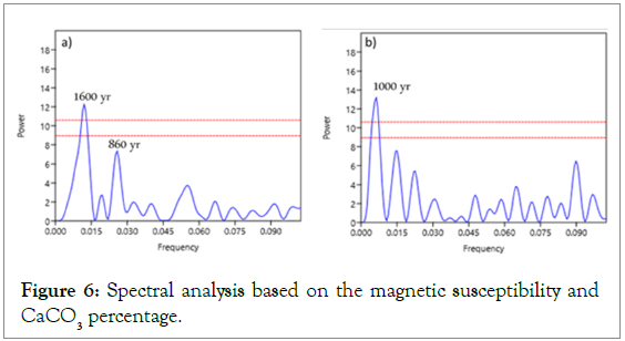 SI and CaCO3: Spectral analysis of the data for the various parameters can highlight the cyclicity clearly identified along the core. However, the spectral analysis of magnetic susceptibility shows that the individualization of a cycle extends over about 1000 years.