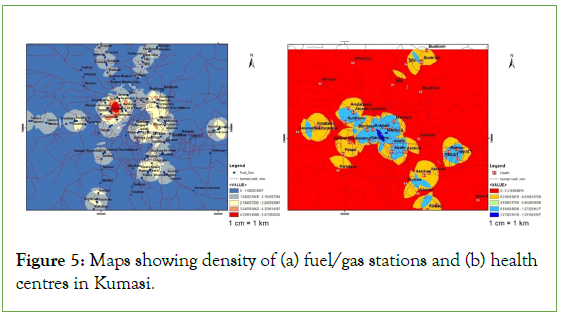 Figure 5: Maps showing density of (a) fuel/gas stations and (b) health centres in Kumasi.