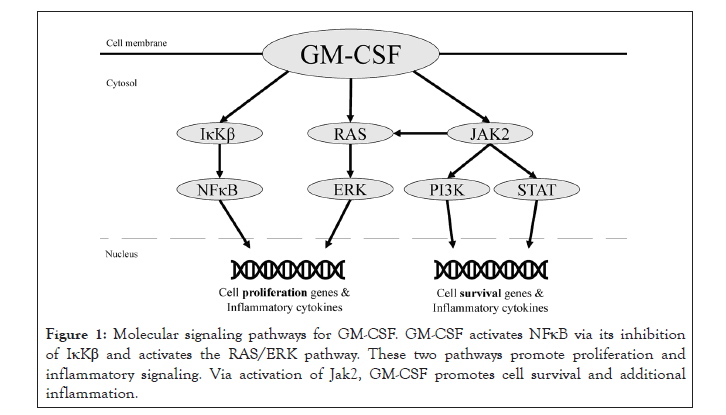Figure 1: Molecular signaling pathways for GM-CSF. GM-CSF activates NFκB via its inhibition of IκKβ and activates the RAS/ERK pathway. These two pathways promote proliferation and inflammatory signaling. Via activation of Jak2, GM-CSF promotes cell survival and additional inflammation.