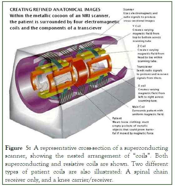 Figure 5: A representative cross-section of a superconducting scanner, showing the nested arrangement of “coils”. Both superconducting and resistive coils are shown. Two different types of patient coils are also illustrated: A spinal chain receiver only, and a knee carrier/receiver.