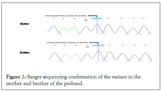 The presence or absence of variant was confirmed in samples of mother and brother using bidirectional Sanger sequencing. Father was not available and so his sample could not be tested for the identified variant.