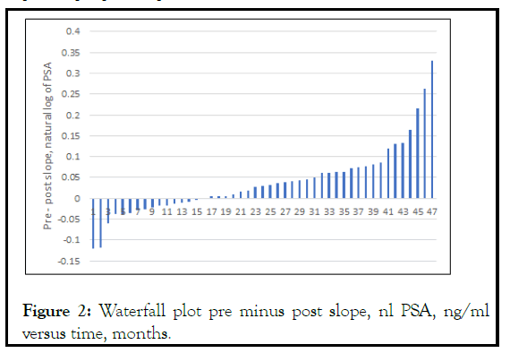 Figure 2: Waterfall plot pre minus post slope, nl PSA, ng/ml versus time, months.