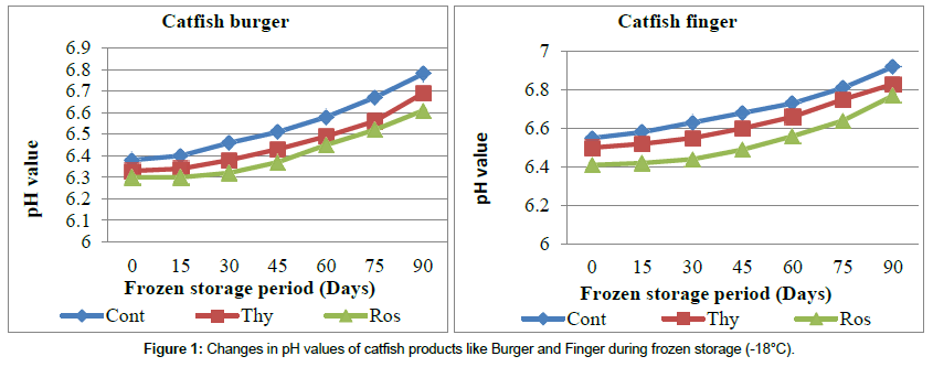 pH value: Changes in pH value of different catfish burgers and fingers samples as affected by essential oils (EOs) and frozen storage are shown in Figure 1. It was observed that pH values of finger samples were higher than those of burger samples, the initial pH values for burgers and fingers samples ranged between 6.30-6.38 and 6.41-6.55 respectively at zero time of storage. These variations may be due to the differences between the ingredients used in the preparation of fish burgers and fingers, the same observations were noticed by El-Lahamy et al. [27].