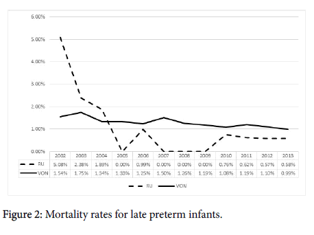Figure 2 shows the mortality rates for late preterm infants in the study period, with a significant reduction from 2005. Average mortality rate from 2005 to 2013 was 0.39% and 1.21% for the RU and the VON respectively. There was a statistically significant difference between these data groups (p<0.05).