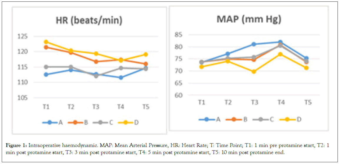 Figure 1: Intraoperative haemodynamic. MAP: Mean Arterial Pressure, HR: Heart Rate; T: Time Point; T1: 1 min pre protamine start, T2: 1 min post protamine start, T3: 3 min post protamine start, T4: 5 min post protamine start, T5: 10 min post protamine end.