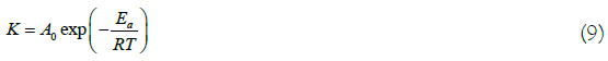 Where: A0 is the pre-exponential factor, h-1; Ea is the activation energy, J mol-1; R is the universal gas constant, 8.314 J mol-1 K-1, and; T is the temperature, K.