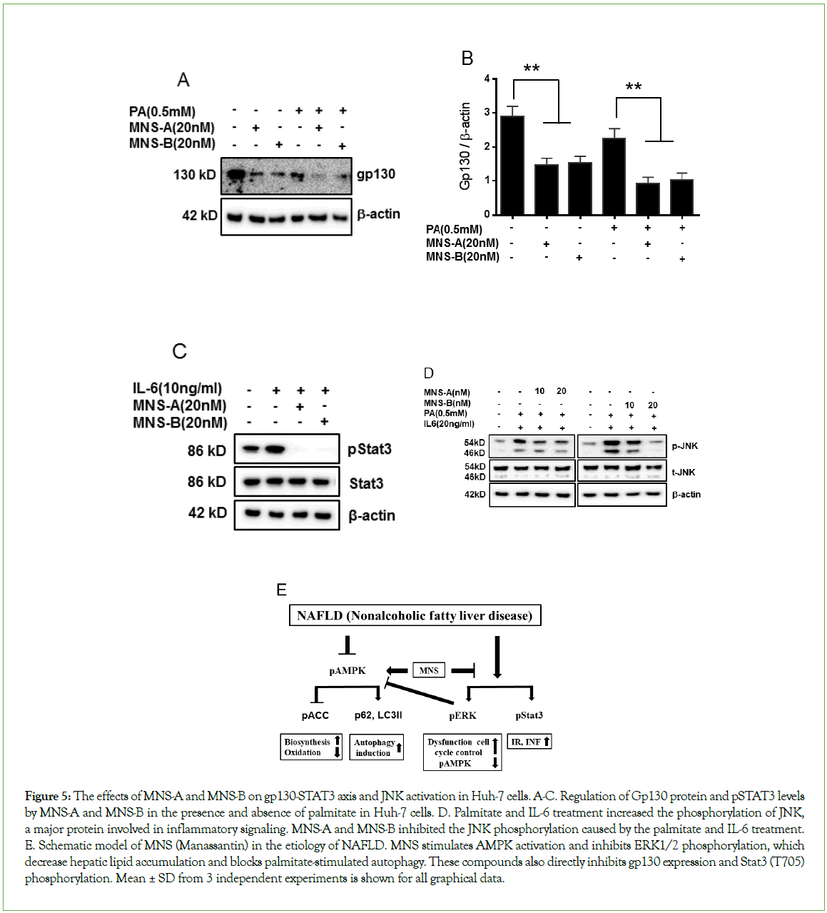 The gp130-STAT3 axis plays key roles in ovarian cancer progression as well as in the pathogenesis of NAFLD [6-26]. To evaluate the gp130-STAT3 axis, human hepatocytes were treated with MNS-A or MNS-B in the presence of a normal glucose (5.5 mM) concentration with or without palmitate or IL-6. Palmitate or IL-6, activates Janus kinase (JAK)-signal transduction and transcription via the gp130/ Stat3 axis [6]. In the current study, the expression of gp130 was markedly decreased by MNS-A (20 nM) or MNS-B (20 nM) in palmitate-treated hepatocytes. The Stat3 phosphorylation level was also markedly decreased in IL-6-treated hepatocytes (Figures 5A-5C, p<0.01 for gp130 or for pStat3). The specific effects of MNS-A and MNS-B on the gp130-STAT3 axis were confirmed by adding palmitate or IL-6 in hepatocytes. Furthermore, the JNK phosphorylation level was significantly increased in the palmitate and IL-6 treated hepatocytes (Figure 5D, p<0.01). Both MNS-A and -B were able to significantly inhibit the JNK phosphorylation level in the palmitate and IL-6 treated hepatocytes. An important observation to note is that MNS-B is dose dependent as shown by its increasing inhibitory effect at higher concentrations (Figure 5D, p<0.01). A schematic model was made that summarizes the in vitro effects of the MNS compounds in the etiology of NAFLD (Figure 5E).