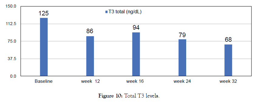Female 27 diagnosed with hyperthyroidism. Her doctor prescribed Carimazol but she opted to use Metadichol. After 4 months all her Thyroid biomarkers returned normal. She stopped Metadichol use at 10 month and a year later at month 22 her biomarkers are still in the normal range (Figures 20 and 21).