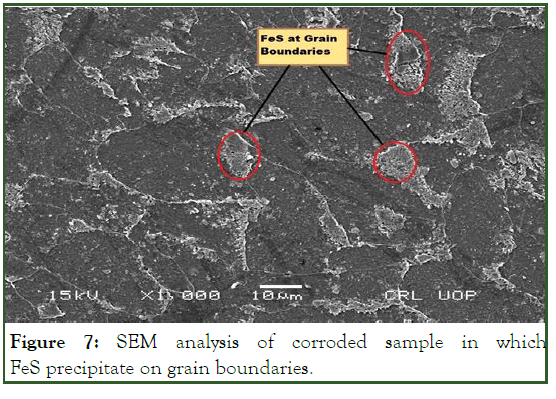 Figure 7: SEM analysis of corroded sample in which FeS precipitate on grain boundaries.