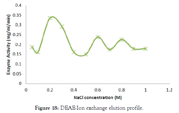 Ion exchange chromatography: Dialyzed enzyme (2 mL) was loaded onto an anion exchange DEAE Cellulose column. The column was packed with activated DEAE-cellulose equilibrated with 50 mM phosphate buffer (pH 8.0). The height of column was 20 cm with the 2.5 cm diameter. The protein was eluted with the 0.5 to 1 M NaCl gradient. The 10 fractions were collected having 5 mL volume of each fraction with the flow rate of 1mL/min. All the steps were carried out at room temperature.
